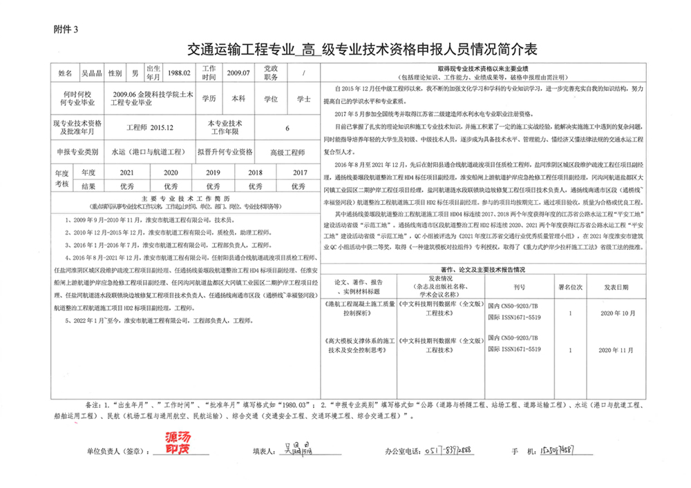 關(guān)于吳晶晶同志申報交通運輸工程水運(港口與航道工程)專(zhuān)業(yè)高級工程師的公…